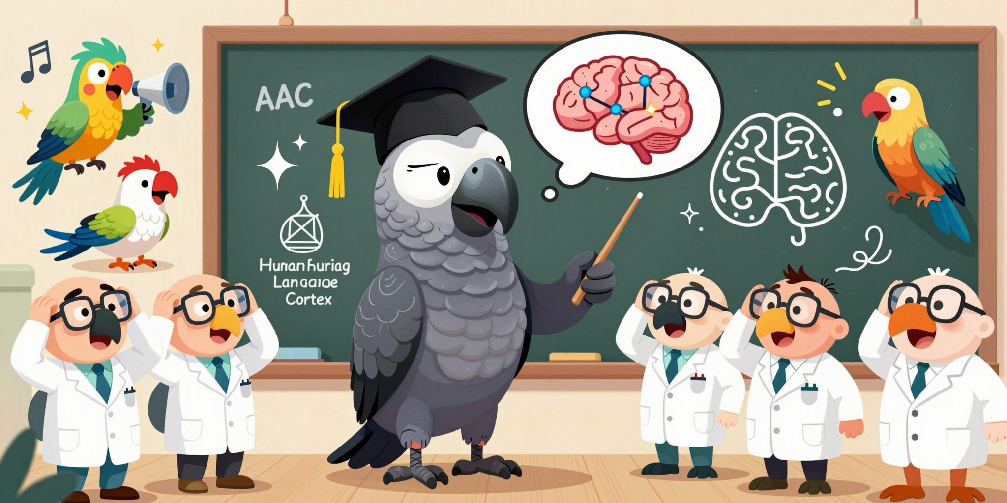 鸚鵡大腦中最引人注目的結構莫過於前弓狀皮質中央核(AAC),這個區域被科學家稱為鸚鵡的「聲音學習中樞」。根據2025年《自然》期刊的研究,AAC在鸚鵡大腦中扮演著類似人類語言皮層的角色,專門負責處理和控制複雜的聲音產生。這個區域就像一個精密的「聲音調音台」,其中約51%的神經元對特定音高具有選擇性響應,能夠實時微調發聲頻率。當鸚鵡透過鳴管(syrinx)——鳥類特有的發聲器官——產生聲音時,AAC中的不同神經元會接力激活,形成規律性的神經活動梯度,完美複製了人類語言皮層的音高編碼機制。研究顯示,虎皮鸚鵡的AAC能夠動態組合聲音元素,僅需5個最優神經元就能精準預測發聲頻率,這種高效的編碼方式使鸚鵡能夠靈活模仿人類語音並創造新的聲音組合。這種神經結構的驚人相似性,使鸚鵡成為研究人類語言障礙(如失語症、帕金森病)的理想動物模型,為語言治療和腦機接口技術提供了新的研究方向。